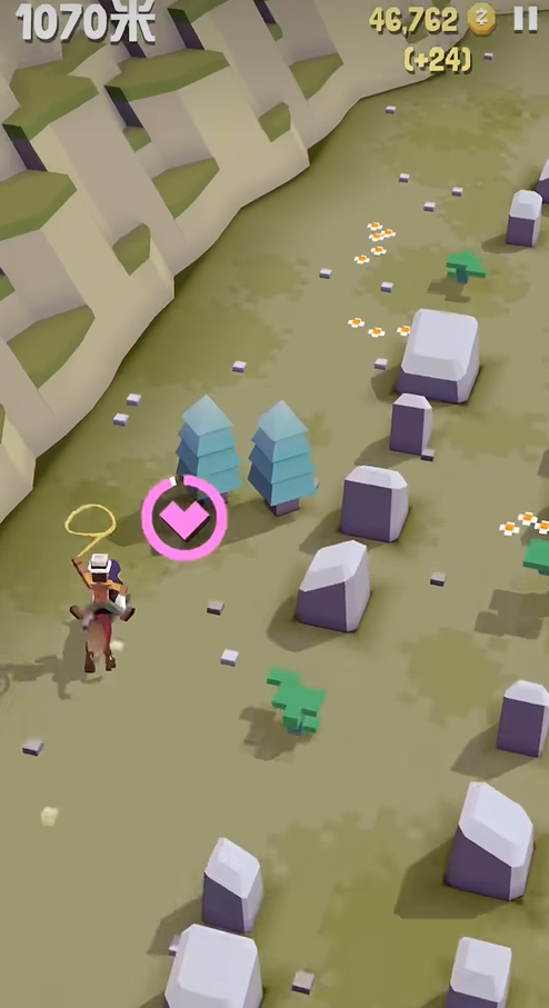 臭臭象的外观具有较高的辨识度,这有助于玩家在高速奔跑中快速锁定目标。根据游戏内的设定,它是一种浑身带着花的、色彩斑斓的大象。当你在一片动物群中看到一个花纹格外鲜艳醒目的大象时,那很可能就是你的目标。确认目标后,接下来的步骤与其他动物抓捕类似:操控牛仔接近它,瞅准时机松开当前骑乘的动物,让牛仔飞出并落在臭臭象的背上。紧接着,你需要立即长按屏幕维持骑乘,并小心操控方向以躲避前方的树木、岩石等障碍物,同时注意屏幕上方出现的爱心进度条。